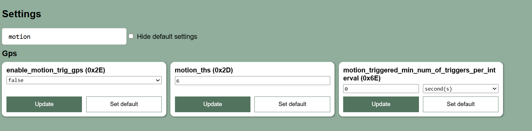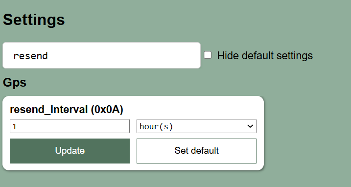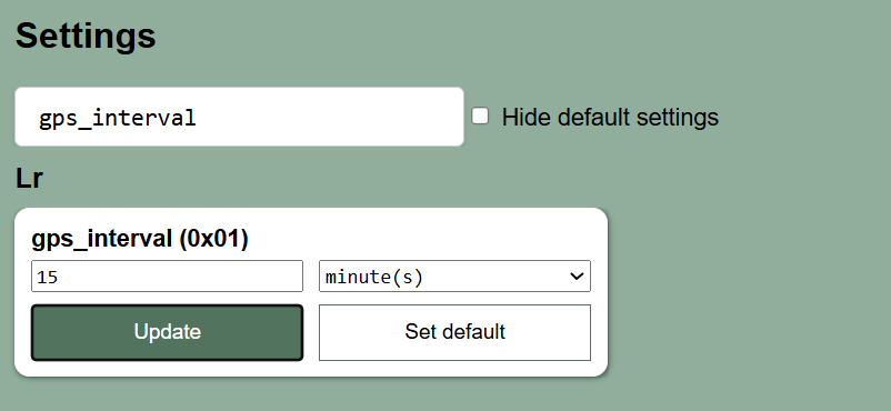 ublox_send_interval (0x02) = 12 hourshot_fix_retry (0x15) = 1hot_fix_timeout (0x17) = 90 secondshorizontal_accuracy (0x13) = 25 metersIn any case, make sure to disable the send flag (send_flag (0x0C)) for