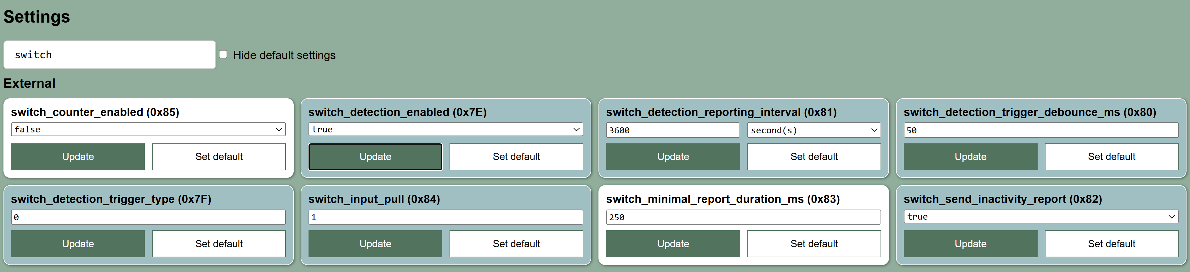 external_switch_detection_enabled = TRUEexternal_switch_detection_trigger_type = 0 (This is used for our default Normally Closer REED switch attached)external_switch_detection_trigger_debounce_ms = 50 msexternal_switch_detection_reporting_interval = 3600 seconds = 1 hourexternal_switch_send_inactivity_report = TRUEexternal_switch_minimal_report_duration_ms = 250 msexternal_switch_input_pull = 1 (PULL UP)external_switch_counter_enabled = FALSE
